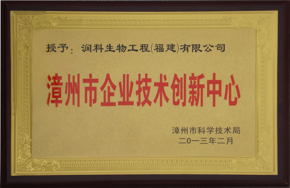 ????? 2013年2月,為進一步貫徹落實漳州市十五屆人大二次會議和政協第十二屆漳州市委第二次會議的會議精神,促進科技型企業成為技術創新主體,提高其自主創新能力和競爭力。經漳州市科學技術局研究,決定認定潤科生物工程(福建)有限公司為2012年度漳州市企業技術創新中心之一,并授予銅匾。