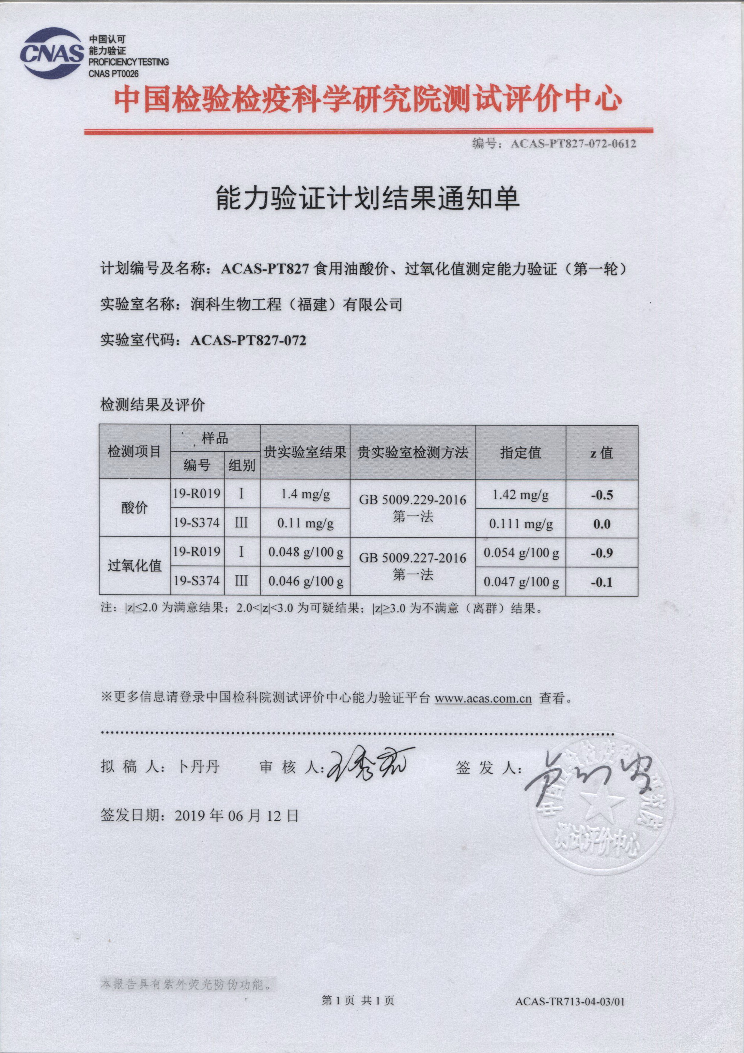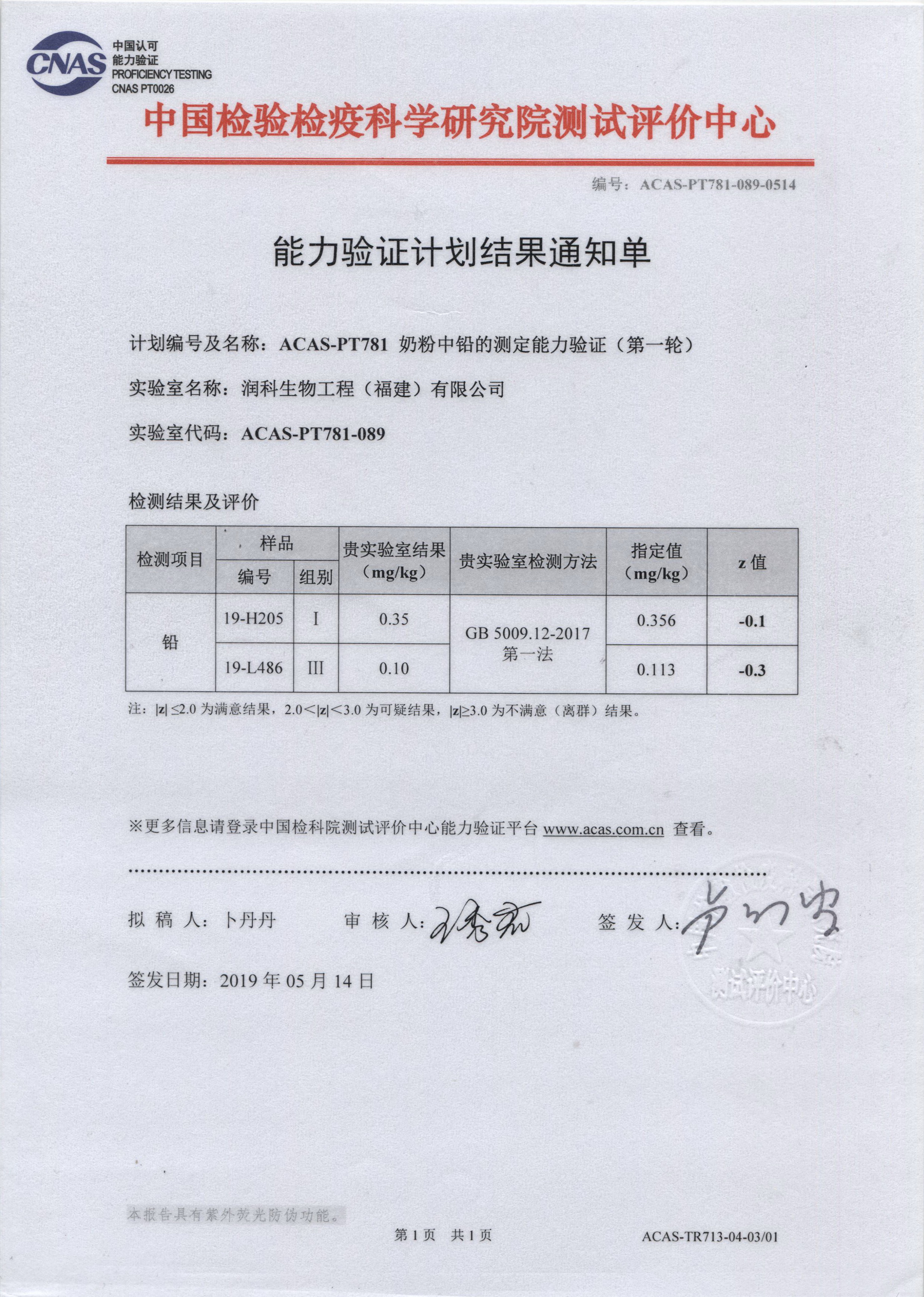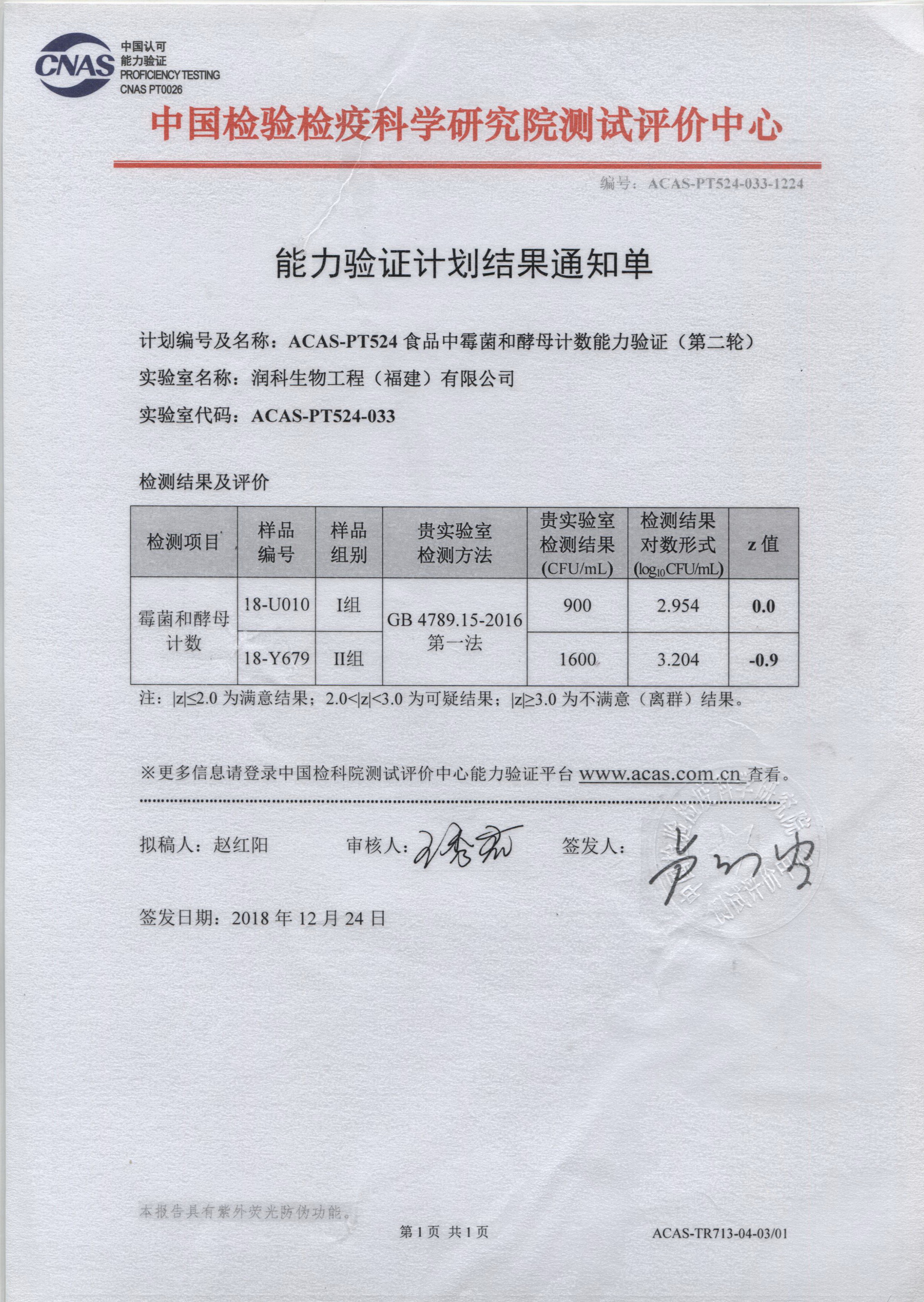 ?????? 潤科生物中心實驗室積極參加中國檢驗檢疫科學研究院測試評價中心開展的能力驗證計劃,累計已參與了鄰苯二甲酸二丁酯、硝酸鹽、菌落總數、大腸菌群、阪崎腸桿菌、霉菌和酵母計數、鉛、酸價、過氧化值等15項指標檢測能力驗證,驗證評價結果均為滿意。