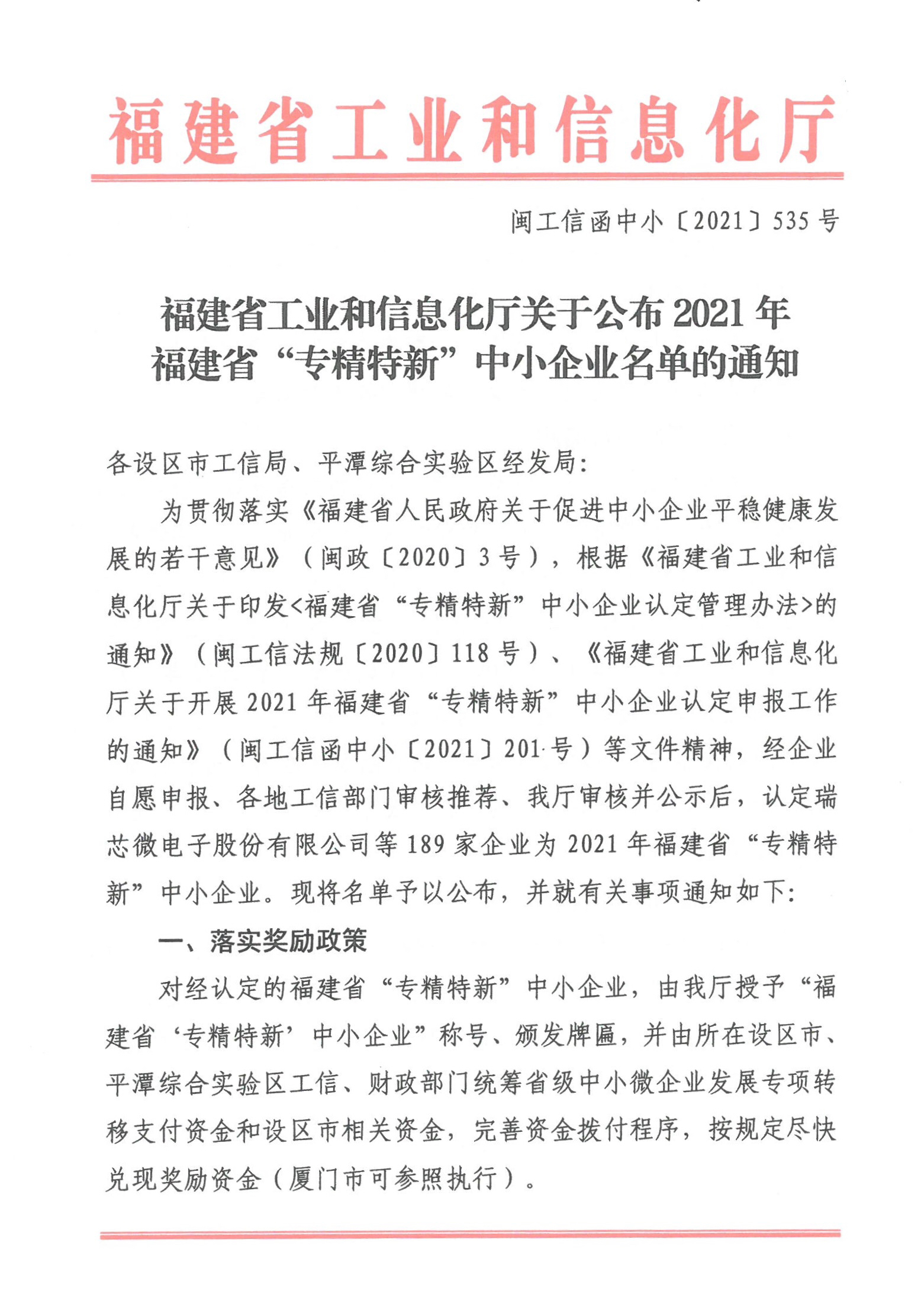 我司獲福建省“專精特新”中小企業(yè)認(rèn)定